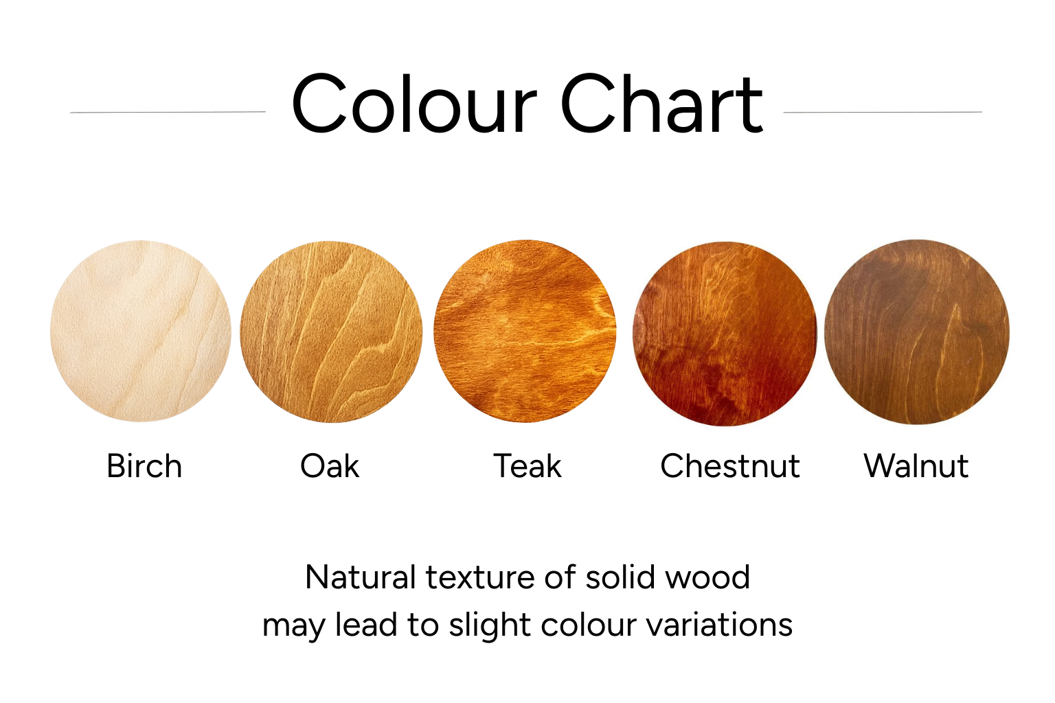 Birch, Oak, Teak, Chestnut and Walnut.